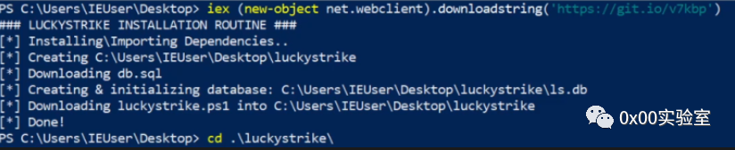 下一步是将 Luckystrike 下载到您的桌面,这可以通过在您的桌面上运行以下 PowerShell 命令来完成:![]()