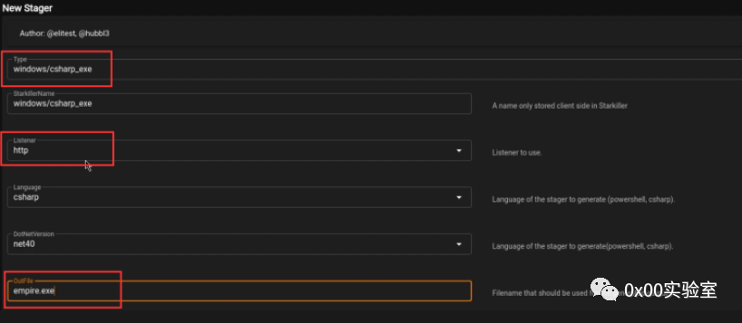 2.将是设置我们的 stager,这可以通过展开侧边栏并单击 stager 菜单项来完成。之后,您需要指定 windows/csharp_exe stager,如下面的屏幕截图中突出显示的那样![]()