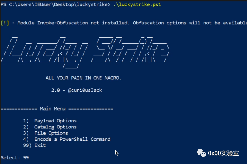 我们现在可以通过导航回 Luckystrike 主菜单并选择“文件选项”菜单选项来生成恶意文档,如下面的屏幕截图中突出显示的那样。![]()