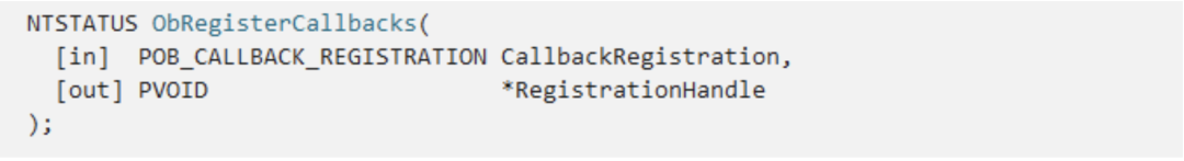 同样系统提供了ObRegisterCallbcaks函数对对象回调进行注册,实现监控系统对象。以下为该函数的声明,其中主要关注第一个参数CallbackRegistration,该参数指向了一个OB_CALLBACK_REGISTRATION结构体,需要为其注册信息: