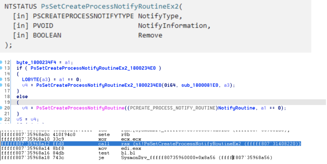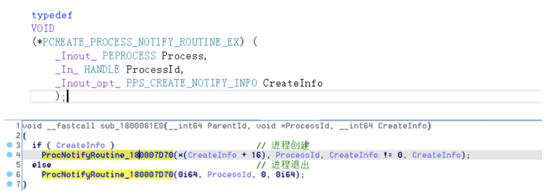 系统主要使用了PsSetCreateProcessNotifyRoutine\PsSetCreateProcessNotifyRoutineEx2函数设置进程创建回调,从而实现对系统进程创建进行监控,函数声明如下,其中参数NotifyInformation是一个特定的函数指针,当进程创建或退出时会触发到:
