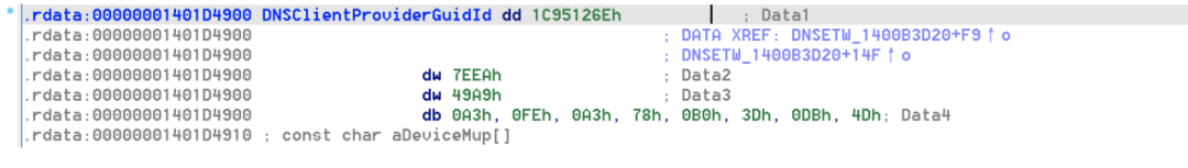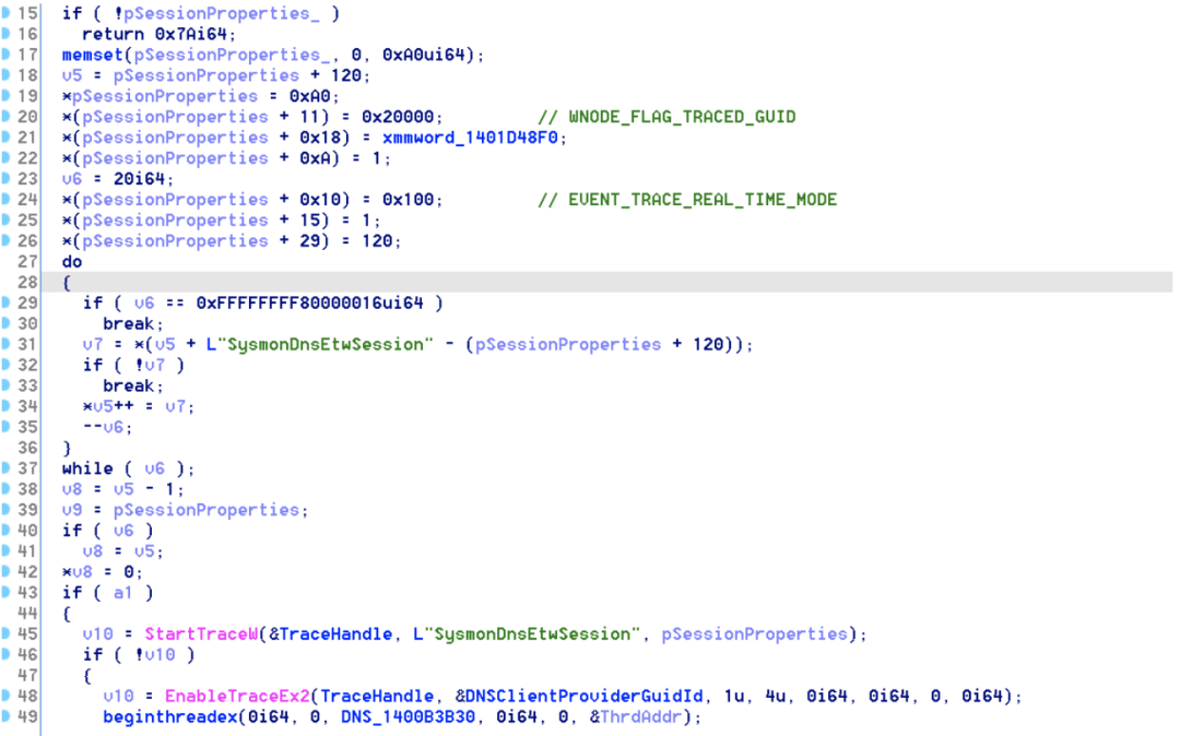 DNS监控也是使用ETW事件进行监听,不同的是这里自定义LOGSESSION_NAME为SysmonDnsEtwSession,通过EnableTraceEx2传入一个需要监控的ProviderGuid(DNSClientProviderGuid),并传入EVENT_CONTROL_CODE_ENABLE_PROVIDER(1)来开启ETW的监控: