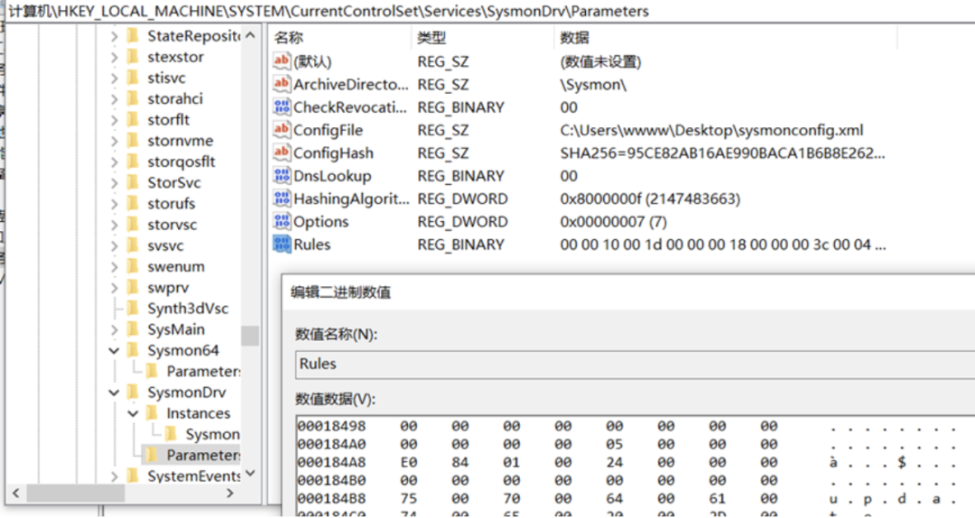 Sysmon -c 可以用来更新自己写的xml规则,会把规则位置、规则内容、规则hash等一系列数据存放在注册表中: