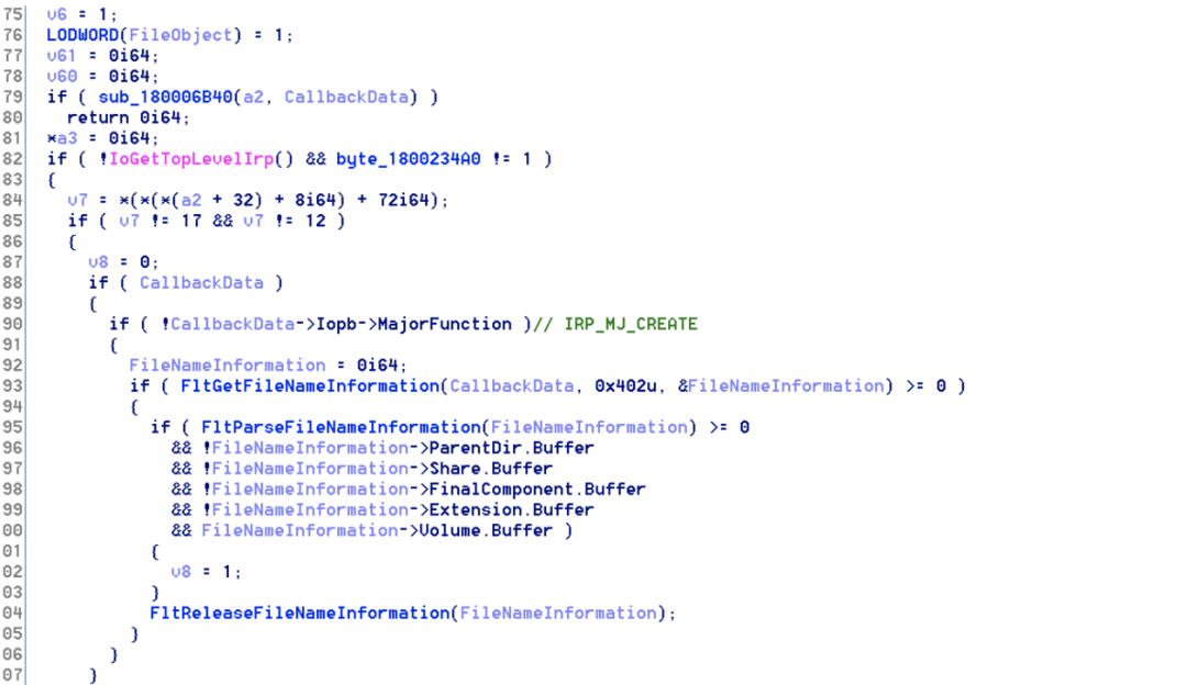 FltPreOperation_1800021A0是操作前的回调函数,其具体实现基本是根据CAllbackData->Iopd->MajorFunction的消息类型来进行后续的过滤操作,像下图是如果获取到IRP_MJ_CREATE就调用FltGetFileNameInformation
