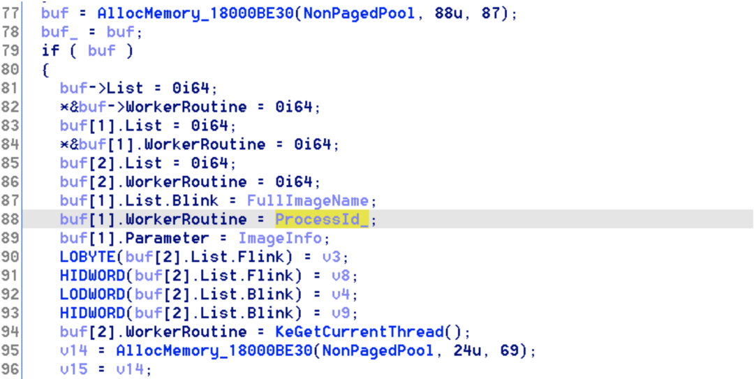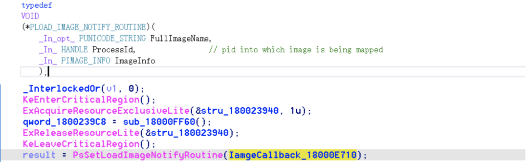 PLOAD_IMAGE_NOTIFY_ROUTINE NotifyRoutine是回调函数指针,可以获取系统中驱动模块和DLL模块的加载信息,其声明如下: