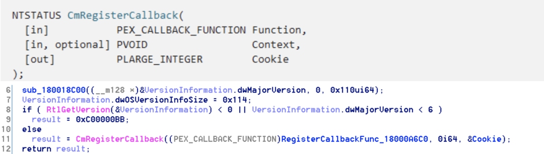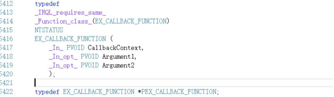 系统同样提供了CmRegisterCallback函数对系统设置注册表进行监控,其函数声明如下,其中主要关注PEX_CALLBACK_FUNCTION这个参数为回调函数: