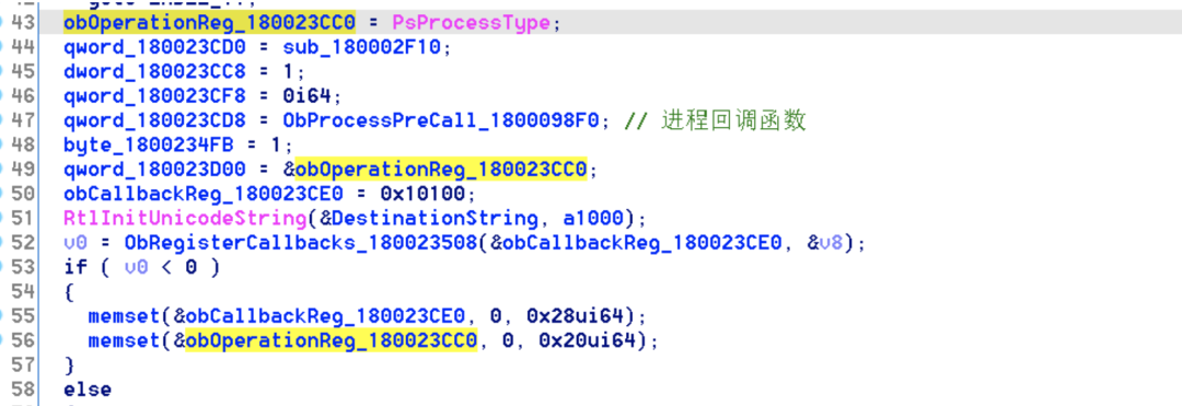 下面分别是设置OB_CALLBACK_REGISTRATION、OB_OPERATION_REGISTRATION两个指针,ObProcessPreCall_1800098F0为操作前的回调函数: