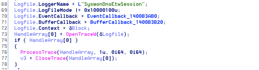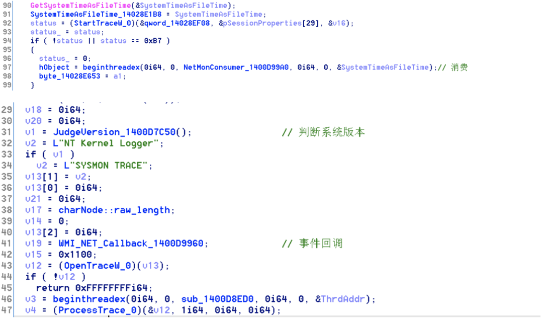 接着新建线程调用OpenTrace()打开事件通道,对指定LOGGER_NAME的Etw进行解析: