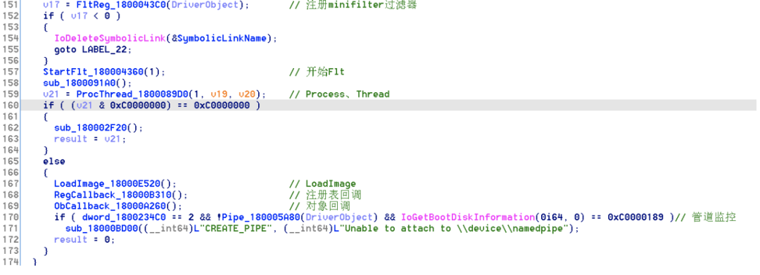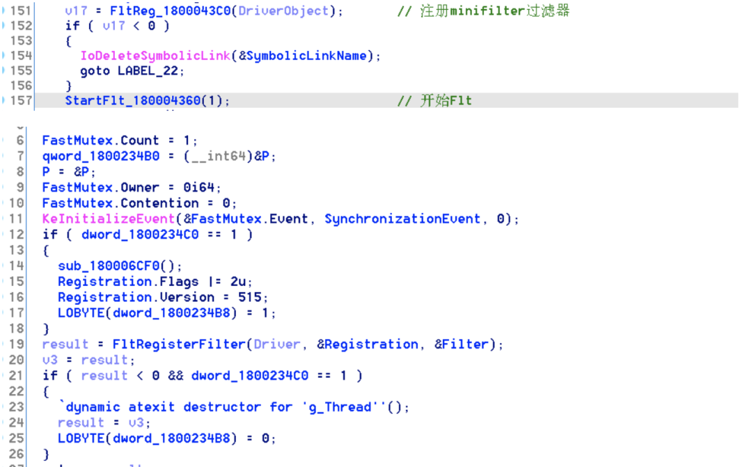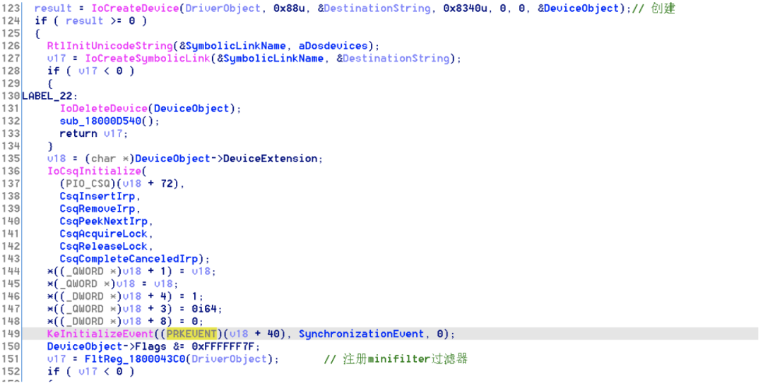 IoCreateDevice创建设备,IoCreateSysmbolicLink创建该设备的符号连接,注册minifilter过滤器: