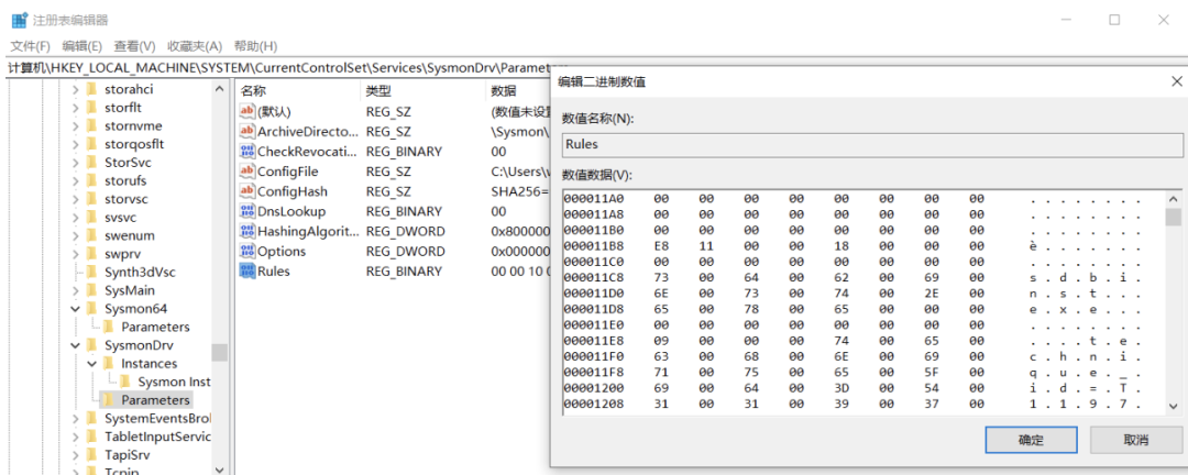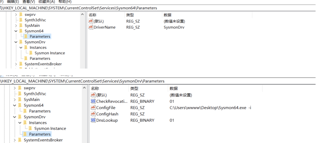 \HKEY_LOCAL_MACHINE\SYSTEM\CurrentControlSet\Services\SysmonDrv\Parameters注册表中的值,后面ring0的驱动部分会读取这些值: