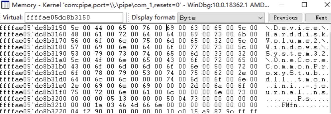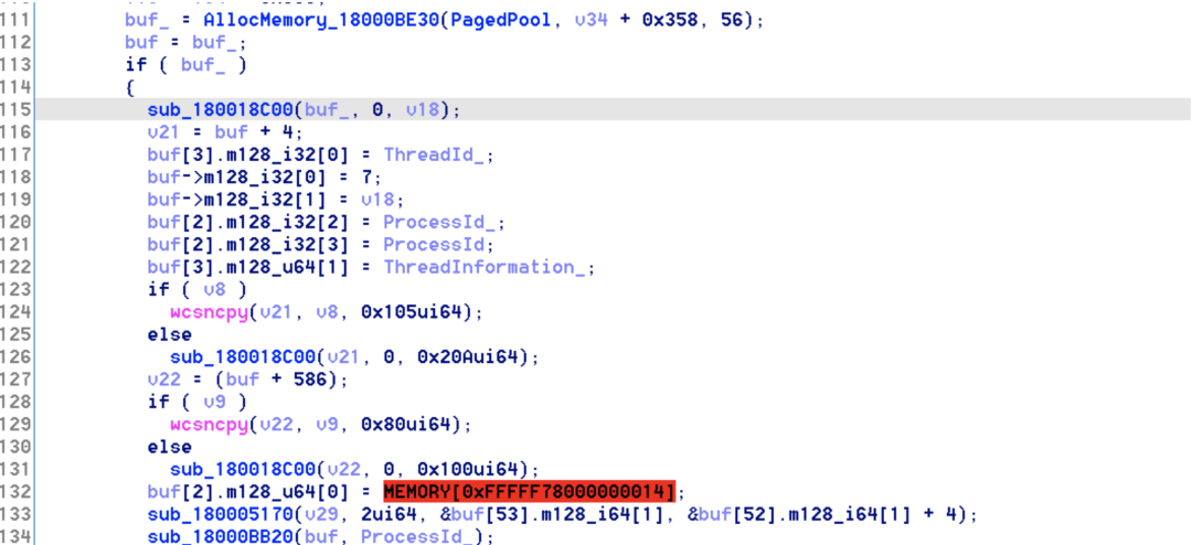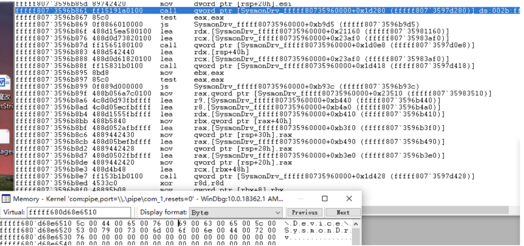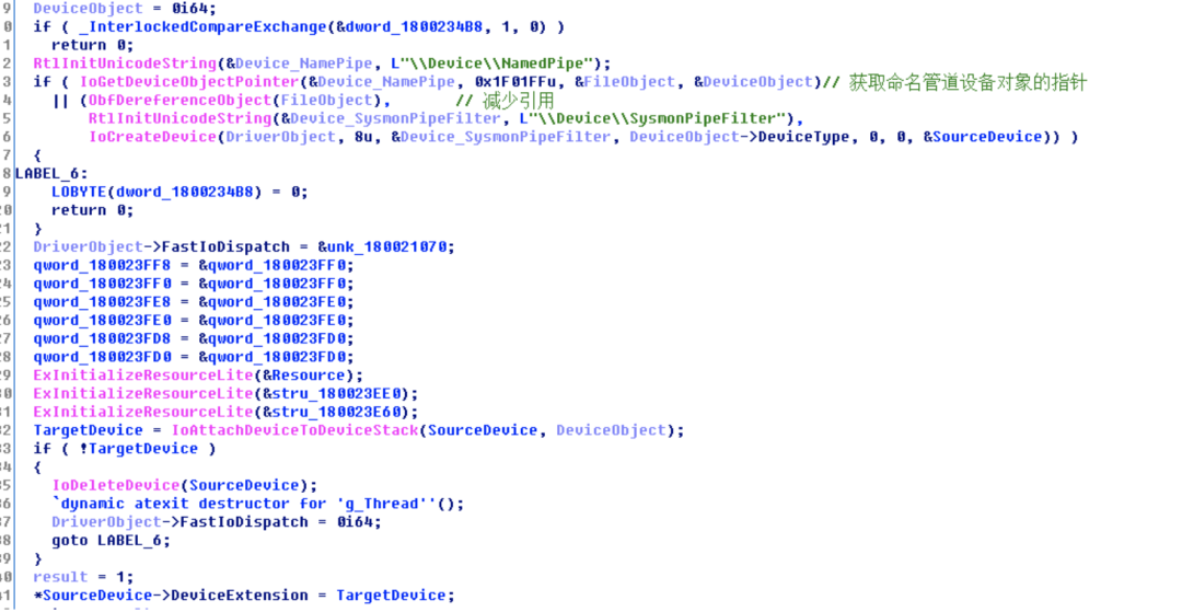 首先,程序调用IoCreateDevice函数创建了名为\Device\SysmonPipFilter的设备,然后调用IoGetDeviceObjectPointer函数获取到\Device\NamePipe驱动设备对象,最后通过IoAttachDeviceToDeviceStack函数将创建的设备附加到\Device\NamePipe设备对像的设备堆栈上。这样所创建的\Device\SysmonPipFilter的设备就是设备栈的栈顶,当有相关消息时,该设备最先获取到该消息。