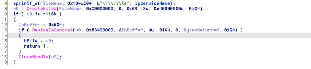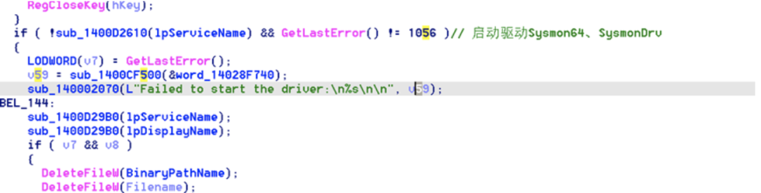 在该函数中先发送0x83400000控制码给SysmonDrv驱动设备,准备开始在驱动中的文件进程线程注册表的监控: