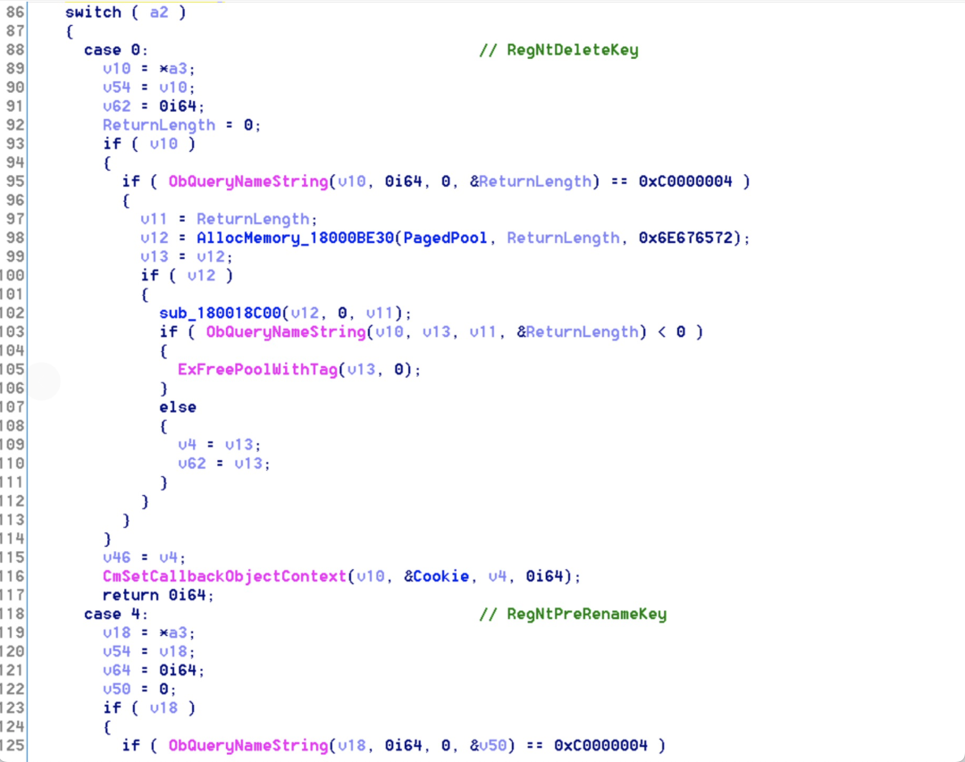 这里sysmon对RegNtDeleteKey、RegNtPreRenameKey、RegNtPostCreateKey、RegNtPostDeleteKey、RegNtPostSetValueKey、RegNtPostDeleteValueKey等一系列注册表操作进行判断,通过ObQueryNameString获取到所操作的注册表路径: