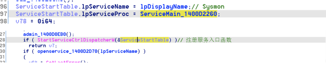 接下来就是Sysmon服务方面的内容,主要包括控制码的发送、网络连接、DNS监控、剪切板监控等。我们先注册服务入口函数ServiceMain_1400D2260: