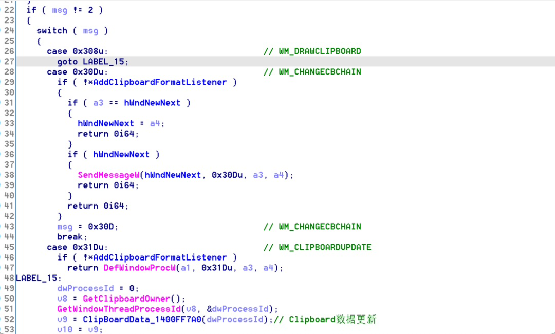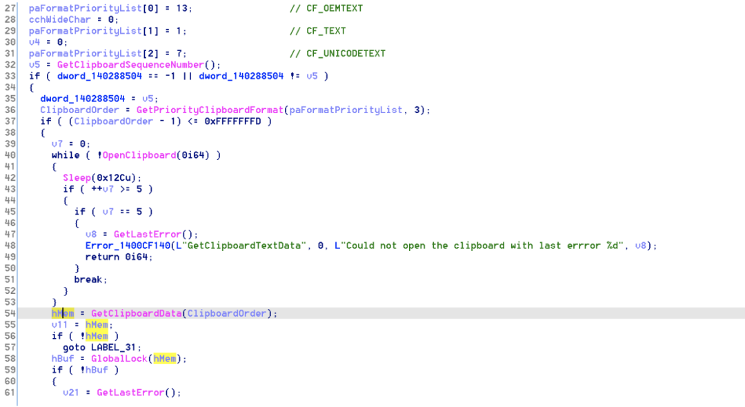 在ClipBoardData_1400FF7A0中处理了三种数据格式CF_OEMTEXT、CF_TEXT、CF_UNICODETEXT的内容,并通过GetClipboardData()、GlobalLock()获取到内容: