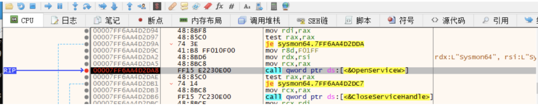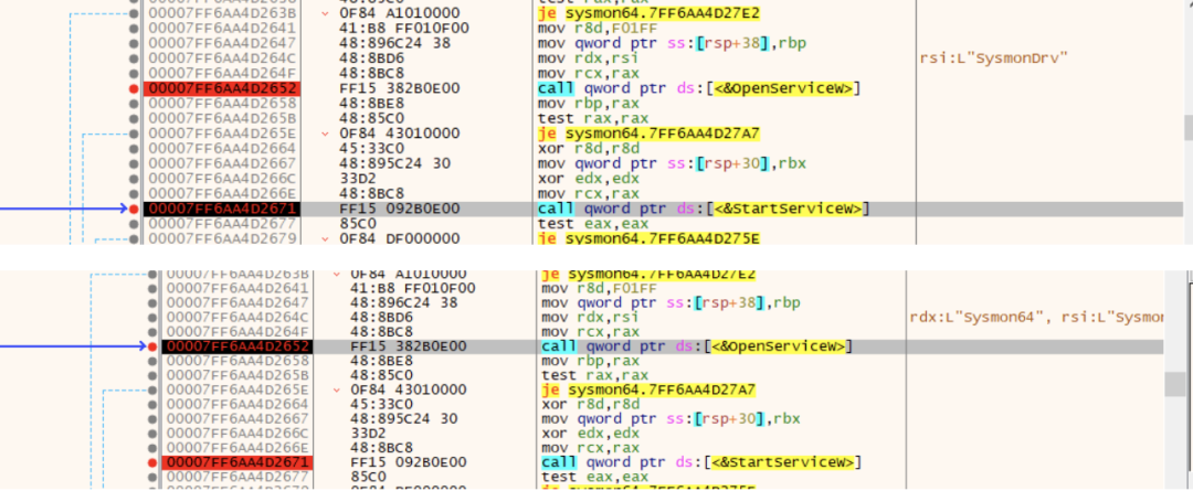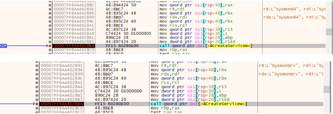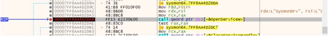 下面我们先看看-i安装所涉及到的操作,-i是初始化安装sysmon,程序先判断是否有sysmon64、sysmonDrv服务,如果没有则再进行后续安装操作: