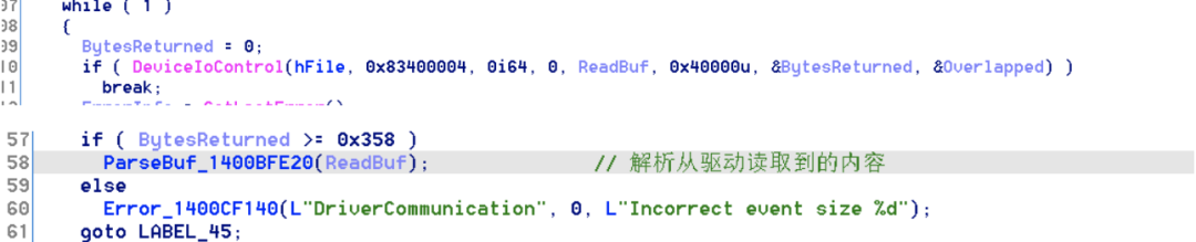 发送0x83400004控制码,不断获取驱动设备返回的数据,并在后面对数据进行解析: