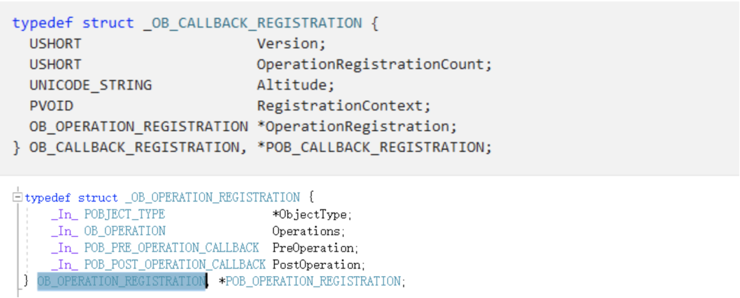 在OB_CALLBACK_REGISTRATION结构体中主要包含了5个参数,主要看第五个参数OperationRegistration,指向OB_OPERATION_REGISTRATION结构体指针,在该结构体中由两个函数指针_In_ POB_PRE_OPERATION_CALLBACK PreOperation、In POB_POST_OPERATION_CALLBACK PostOperation,分别是请求操作前后的回调函数: