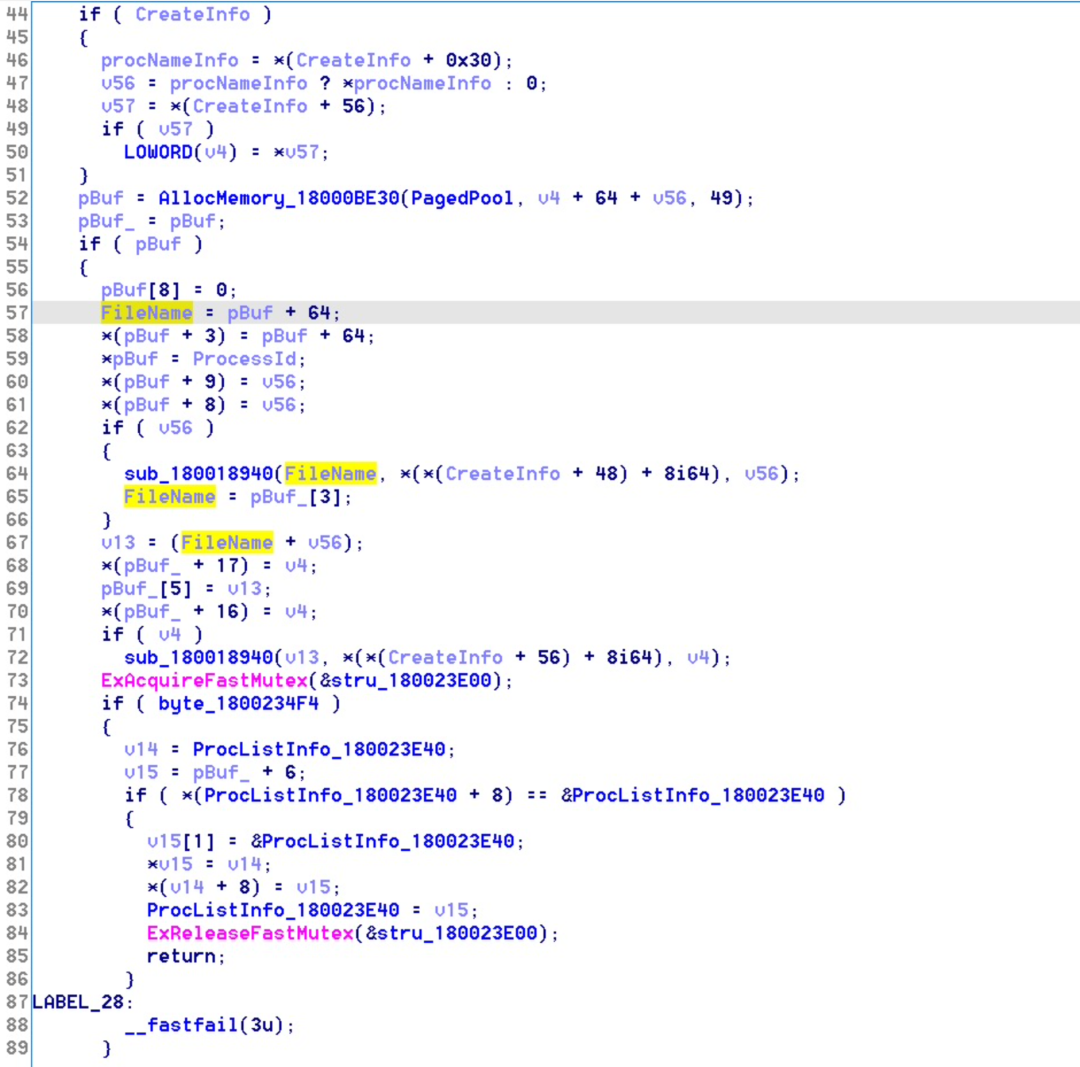 当CreateInfo结构体不为NULL,则代表是进程创建,下面是通过对CreateInfo结构体进行解析收集所创建进程的信息: