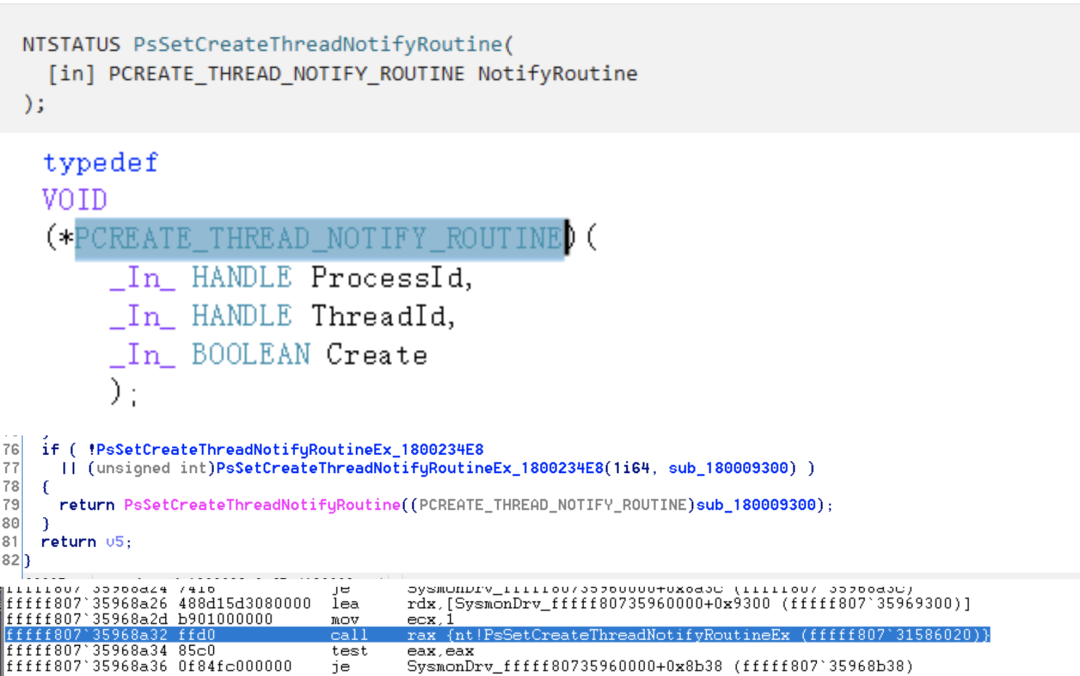 与进程监控类似,系统可以使用PsSetCreateThreadNotifyRoutine函数设置线程创建的1回调,函数声明如下,其中参数NotifyInformation同样是一个特函数指针: