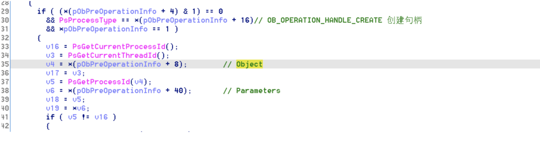 在回调中对操作类型:进行判断是否为创建句柄,然后通过pObPreOperationInfo对象获取具体信息: