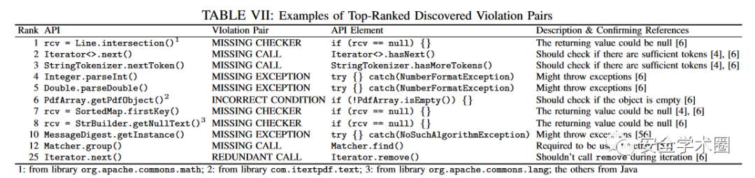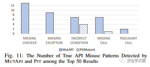 MUTAPI 在项目中生成了大量突变体,并在此基础上获取了大量的 killing relation,而在处理堆栈路径跟踪后,每个客户端获得了 65 个唯一的堆栈跟踪。于是在此基础上提炼了近 300 种 API 误用模式。而在此基础上,人工手动检查了前 50 种模式,并且前 10 种实现了 0.90 的精度,前 50 降低到了 0.78,而排名最高的几种主要是:缺少检测程序、缺少调用、缺少异常、错误条件和冗余调用。