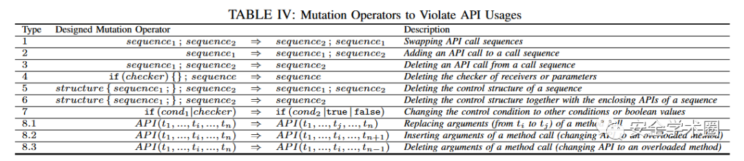这一步主要是构建变体进行测试。首先对每个 API 进行序列化建模,建模中包括 API 涉及的变量、条件等,如表 1 所示。接着在此基础上通过使用一些突变运算符来进行正常 API 的突变,而这些突变运算符也很好想象,例如如果编程时存在 try 却没有 except 则会发生错误,因此删除部分序列便是突变运算符之一,而更多的运算符如表 2 所示。在这种突变的变化上,便可以生成突变体进行后续的测试。