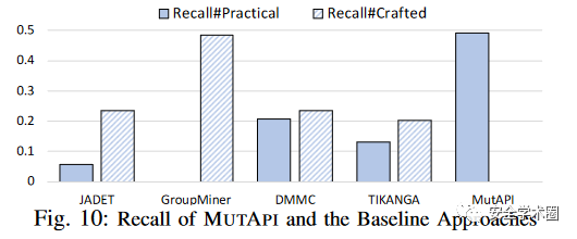 MUTAPI能够检测出53种实际API滥用中的26种。它实现了0.49的最高召回率。在实际设置中,MUTAPI的性能明显优于所有基线方法。此外研究人员进一步调查了MUTAPI无法检测到某些模式的API滥用实例的原因,并发现了三种主要类型的原因:没有正确使用API,没有突变体覆盖和测试套件不足。