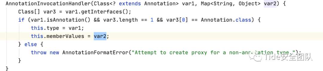 AnnotationInvocationHandler.invoke:关注代码注释部分,它执行了this.memberValues.get(var4),this.membrtValues等于构造方法中的var2也就是当构造方法中传入的var2为LazyMap对象时会执行LazyMap.get方法。