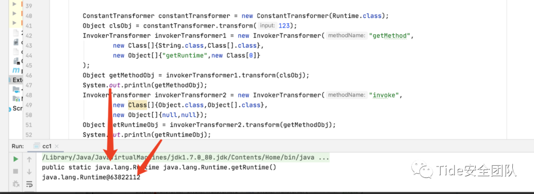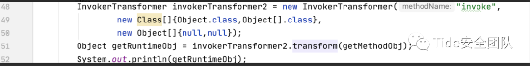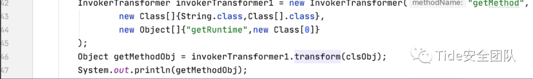 ConstantTransformer constantTransformer = new ConstantTransformer(Runtime.class);Object clsObj = constantTransformer.transform(1);InvokerTransformer invokerTransformer1 = new InvokerTransformer("getMethod",new Class[]{String.class,Class[].class},new Object[]{"getRuntime",new Class[0]});Object getMethodObj = invokerTransformer1.transform(clsObj);System.out.println(getMethodObj);InvokerTransformer invokerTransformer2 = new InvokerTransformer("invoke",new Class[]{Object.class,Object[].class},new Object[]{null,null});Object getRuntimeObj = invokerTransformer2.transform(getMethodObj);System.out.println(getRuntimeObj);