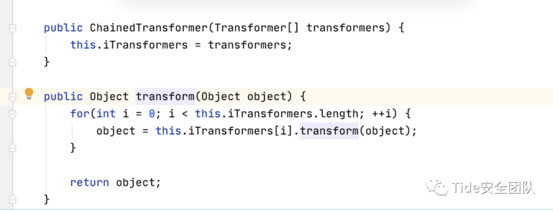 3.ChainedTransformer.transform():此方法实现了对每个传入的transformer都调用其transform方法,并将结果作为下一次的输入传递进去。