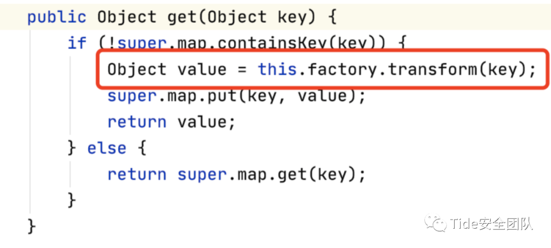 由后至前分析,LazyMap.get():当传入的key不存在时执行this.factory.transform,若此时传入的this.factory为构造好的迭代链chainedTransformer则可执行系统命令。