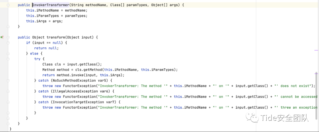 据InvokerTransformer类的构造方法和transform方法源码,可给出具体实现部分代码,“=”下为transform方法注释。