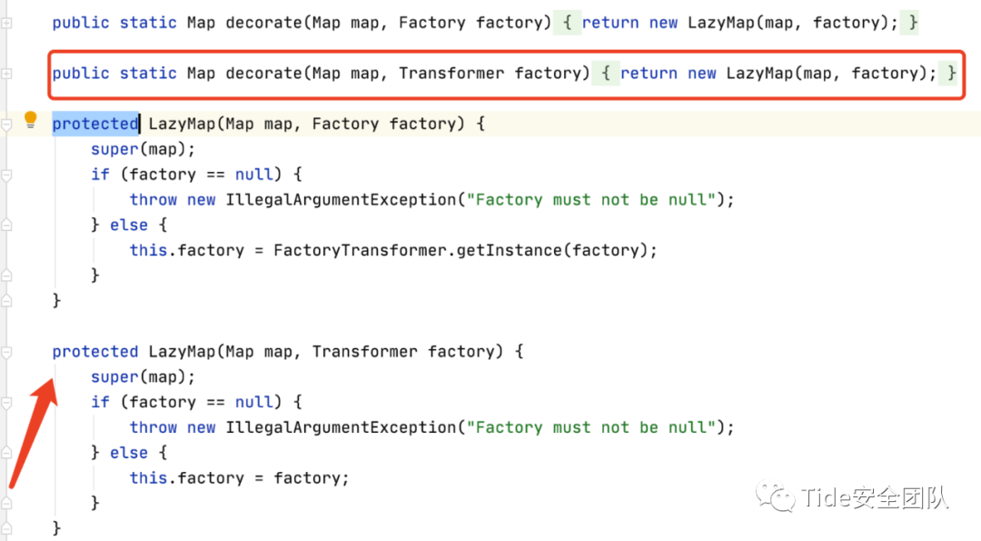 由于LazyMap的构造方法使用protected修饰,故无法直接new一个LazyMap的实例对象,但其提供了decorate方法来实例化一个LazyMap对象。