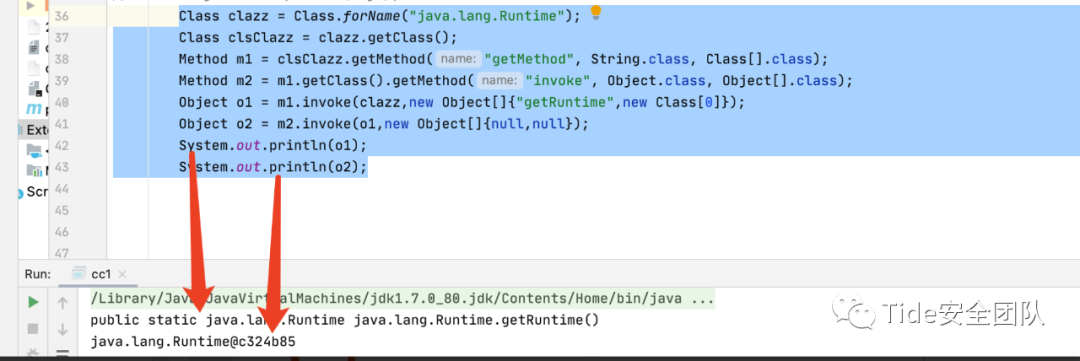Class clazz = Class.forName("java.lang.Runtime");Class clsClazz = clazz.getClass();Method m1 = clsClazz.getMethod("getMethod", String.class, Class[].class);Object o1 = m1.invoke(clazz,new Object[]{"getRuntime",new Class[0]});Method m2 = m1.getClass().getMethod("invoke", Object.class, Object[].class);Object o2 = m2.invoke(o1,new Object[]{null,null});System.out.println(o1);System.out.println(o2);