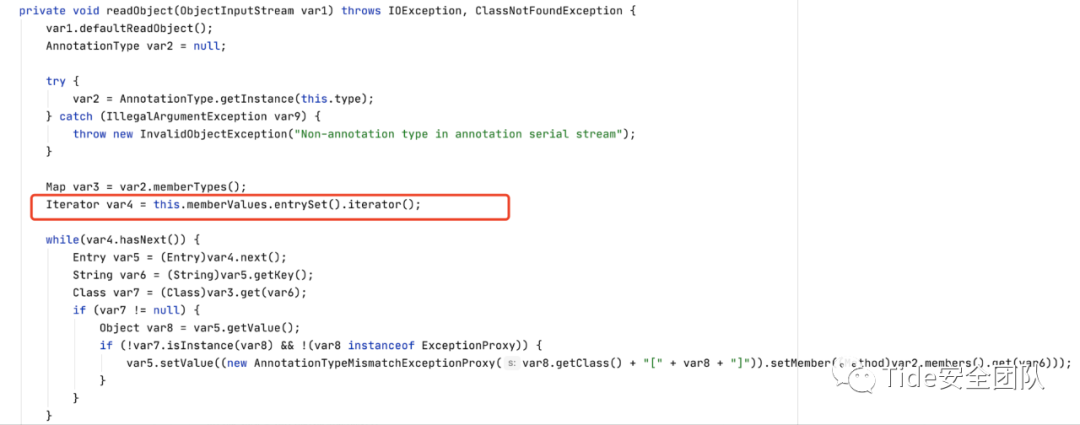 AnnotationInvocationHandler.readObject()方法实现,this.memberValues是其构造方法中传入的Map对象,当其是一个代理Map对象并执行this.memberValues.entrySet().iterator()时会调用memberValues对应InvocationHandler对象的invoke方法。