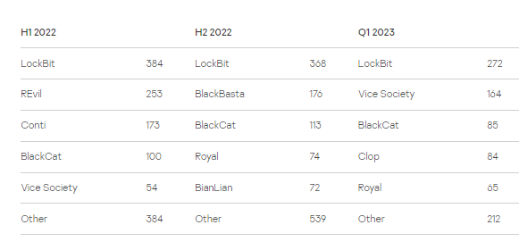 有趣的是,在过去一年中,最具影响力和最多产的五大勒索软件组织(根据其数据泄露网站上列出的受害者数量)发生了巨大变化。现已解散的REvil和Conti在2022年上半年的攻击次数分别排在第二和第三位,在2023年第一季度被Vice Society和BlackCat所取代。2023年第一季度排名前五的其他勒索软件组织是Clop和Royal。