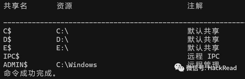 执行net share命令,可以获得Windows默认开启的网络共享,其中C$为C盘共享,ADMIN$为系统目录共享,还有一个IPC$共享。