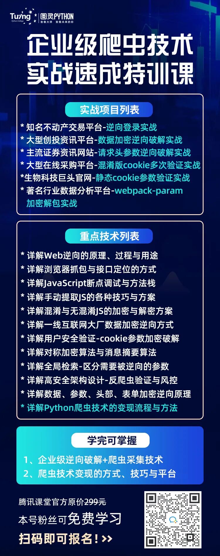 这是一套专讲爬虫逆向破解的高阶技术实战课,迄今为止已帮助近三万学员快速进阶。本次课程将由国际大数据竞赛获奖大佬亲身指导,带领大家进行高阶技术体系+逆向解析项目实战+技术变现路径指导的综合速成训练!