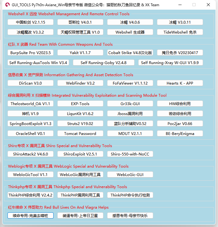 1.GUI_TOOLS_闲客增强版 2022.4.17 在原有工具 "GUI肥胖版v8.0" 做出更新改动,再次致谢工具的原作者 2. GUI_TOOLS_Py7h0n-Axiane_Mac母亲节专版 2023.5.16 由于未能预期的Bug原因,Mac版本推迟发布