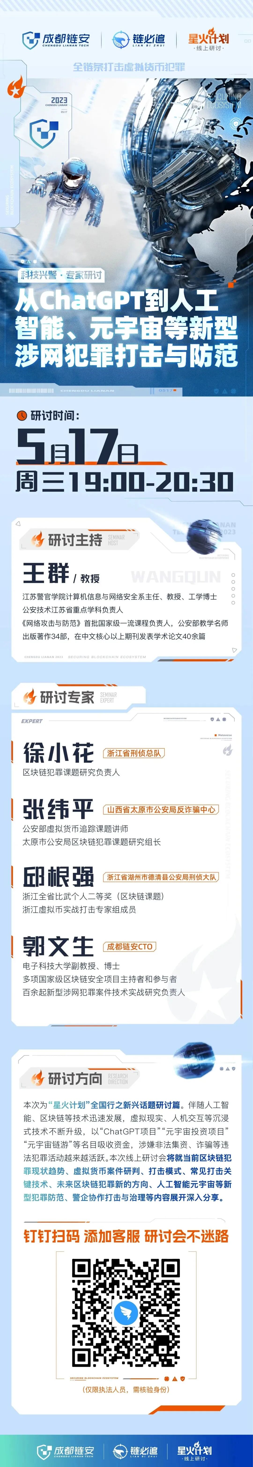 为了助力各类新型经济犯罪打击,成都链安特别举办了一场新型涉网犯罪打击与防范研讨会,邀请了全国各地相关领域的知名专家、大咖齐聚一堂,于5月17日就“人工智能、元宇宙等新型涉网犯罪打击与防范”展开线上研讨。