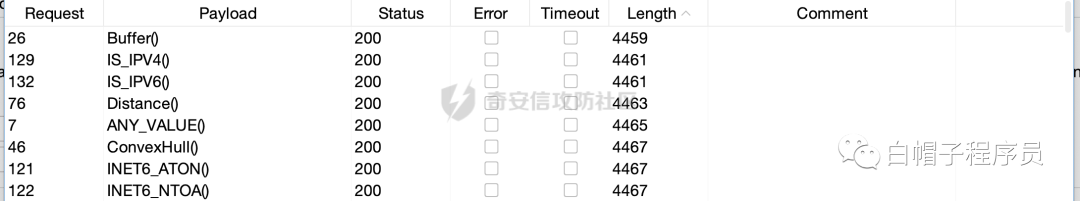 最终结果,发现大多数都是不行的,但是Fuzz的过程中,我发现了一个很有趣的,可能导致绕过的点,那就是WAF似乎没办法处理一些不常见的函数,尝试如下: