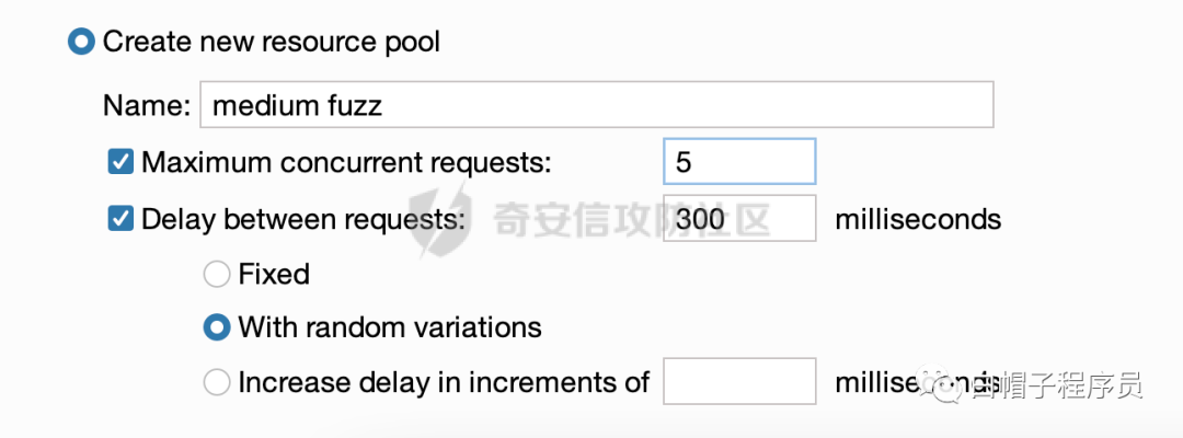 接下来讲下Burp的Intruder技巧,很多新手对爆破的并发问题并不是很care,我个人认为,良好的测试习惯,并发数不能一下子太高,推荐配置如下,每次并发数目在3~5之间,每次间隔在0.3s之间,然后一定的波动,这在一定程度上能起到Bypass WAF的效果。
