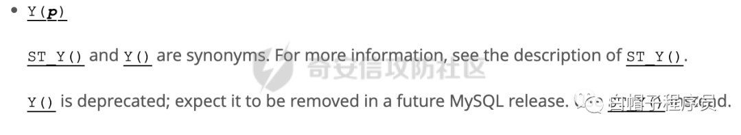 https://dev.mysql.com/doc/refman/5.7/en/gis-point-property-functions.html#function_y虽然官方函数没有给出示例用法,但是给出了ST_Y()的用法,这个ST_Y()在目标环境是不存在报错的,但这两个函数的用法是一致的。