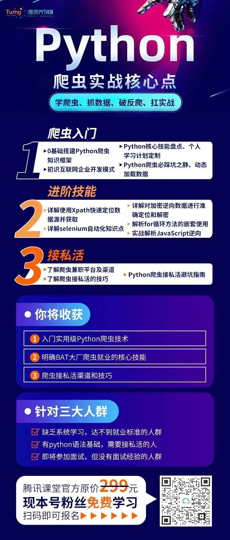 如果你想快速搞定爬虫,尤其是可用于变现的高阶爬虫技术,我建议听一堂【Python爬虫实战核心点】的速成课程,会避免盲目摸索浪费时间,也会解决很多问题。